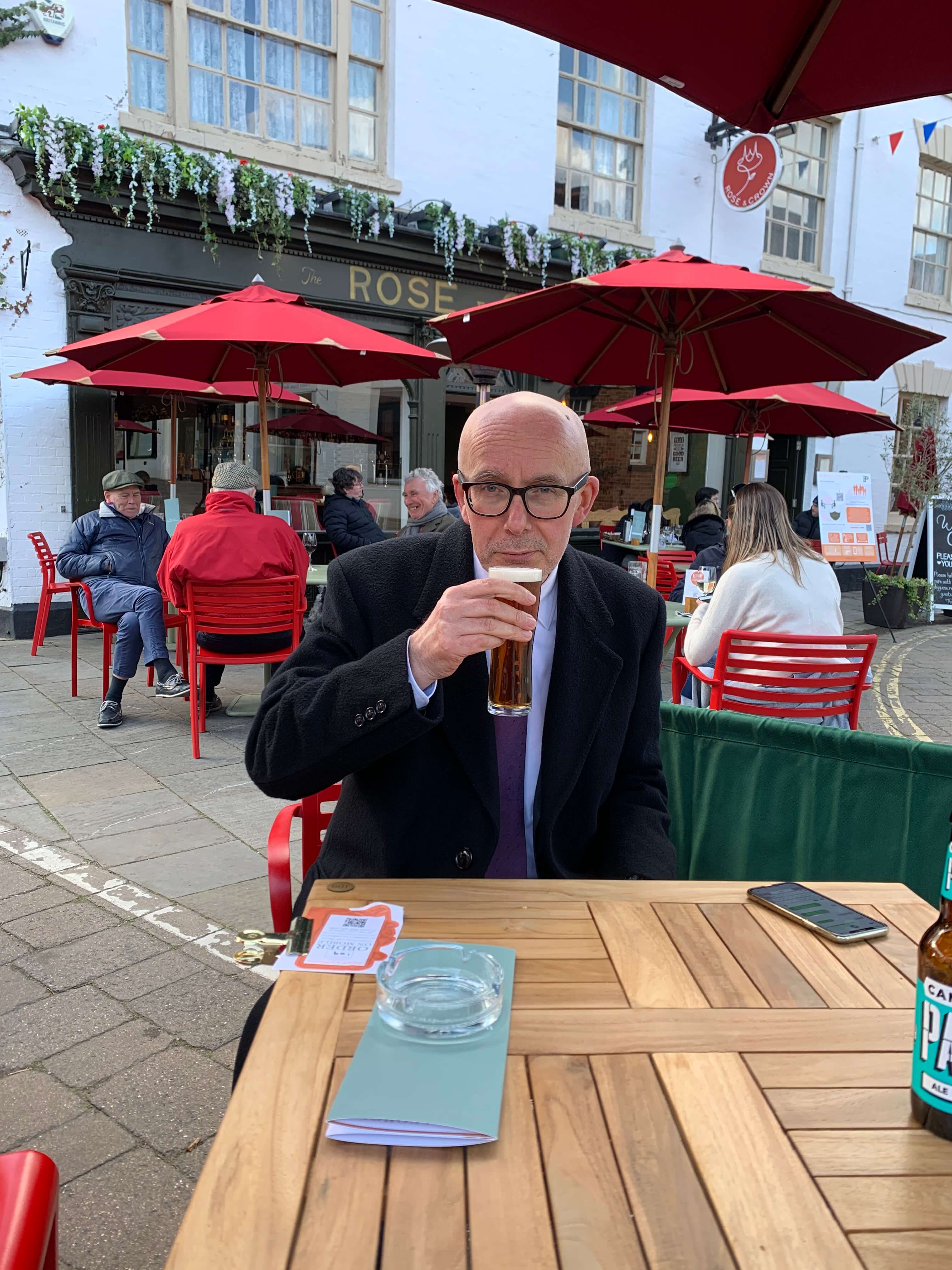 Celebrating the reopening of town centre shops, pubs and restaurants with a pint